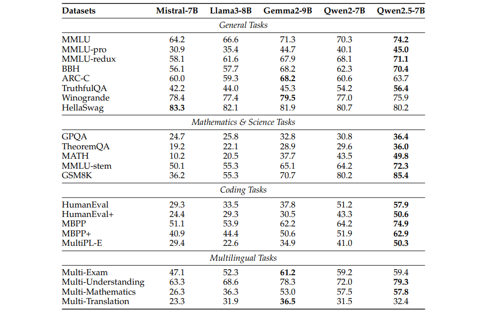 Qwen2.5-7B.对于 7B 级模型,我们主要将 Qwen2.5-7B 与其他领先的 7B+ 模型进行比较,包括 Mistral-7B(Jiang et al., 2023a)、Llama3-8B(Dubey et al., 2024)、Gemma2-9B(Gemma Team et al., 2024)以及我们的前身 Qwen2-7B(Yang et al., 2024a)。结果可以在表4中找到。需要注意的是,Qwen2-7B 和 Qwen2.5-7B 的非嵌入参数只有 6.5B,而 Gemma2-9B 的非嵌入参数为 8.2B。 Qwen2.5-7B 模型在多个基准测试中超越了其前身和同类模型,尽管其非嵌入参数较少。它在多个任务中表现出显著的提升,取得了 MMLU(Hendrycks et al., 2021a)等一般基准的 74.2 分,MATH(Hendrycks et al., 2021b)等数学挑战的 49.8 分,以及 HumanEval(Chen et al., 2021)等编程任务的 57.9 分。
