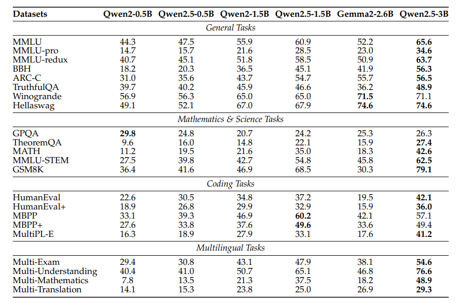**Qwen2.5-0.5B/1.5B/3B。**对于边缘端模型,我们将 Qwen2.5-0.5B、1.5B 和 3B 与已建立的基线模型进行比较:Qwen2-0.5B/1.5B(Yang et al., 2024a)和 Gemma2-2.6B(Gemma Team et al., 2024)。结果如表5所示。Qwen2.5-0.5B、1.5B 和 3B 在几乎所有基准测试中都保持了强劲的表现。特别是 Qwen2.5-0.5B 模型在多个数学和编程任务中超越了 Gemma2-2.6B。
