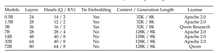 表1:Qwen2.5 开放权重模型的模型架构和许可