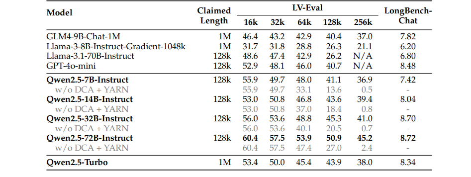 表 17:Qwen2.5 模型在 LV-Eval 和 LongBench-Chat 数据集上的性能。YARN+DCA在32k个token 内并未改变模型的行为。