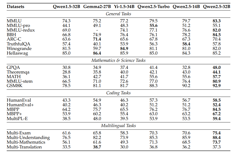 Qwen2.5-14B/32B & Qwen2.5-Turbo。Qwen2.5-Turbo、Qwen2.5-14B 和 Qwen2.5-32B 模型的评估结果与相似规模的基线模型进行对比。这些基线模型包括 Yi-1.5-34B(Young et al., 2024)、Gemma2-27B(Gemma Team et al., 2024)和 Qwen1.5-32B(Qwen Team, 2024b)。结果如表3所示。Qwen2.5-14B 模型在各项任务中表现稳定,尤其在一般任务如 MMLU 和 BBH 中表现突出,分别获得了 79.7 和 78.2 的分数,超越了更大规模的竞争对手。同时,Qwen2.5-32B,尤其在特定任务中展现出卓越的能力,通常超过了同规模更大的模型。值得注意的是,Qwen2.5-32B 相较于其前身 Qwen1.5-32B 显著提升,尤其在数学和编程任务中,取得了 MATH 任务的 57.7 和 MBPP 任务的 84.5 分数。对于 Qwen2.5-Turbo,尽管其训练成本和推理成本显著低于 Qwen2.5-14B,但在任务表现上与 Qwen2.5-14B 不相上下,甚至在 MMLU-Pro 基准测试中,其得分超过了 Qwen2.5-32B。