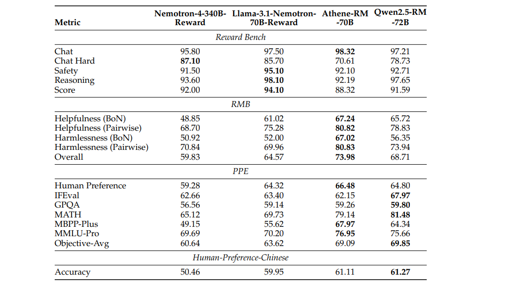 总体而言,我们的研究发现,Llama-3.1-Nemotron-70B-Reward 在 Reward Bench 上表现突出,而 Athene-RM-70B 在 RMB 基准上表现最佳。Qwen2.5-RM-72B 在 PPE 和 Human-Preference-Chinese 评估中领先,仅在 RMB 上排名第二,紧随 Athene-RM-70B 之后,并在 Reward Bench 上表现与 Nemotron-4-340B-Reward 相当,虽然略逊色于 Llama-3.1-Nemotron-70B-Reward。