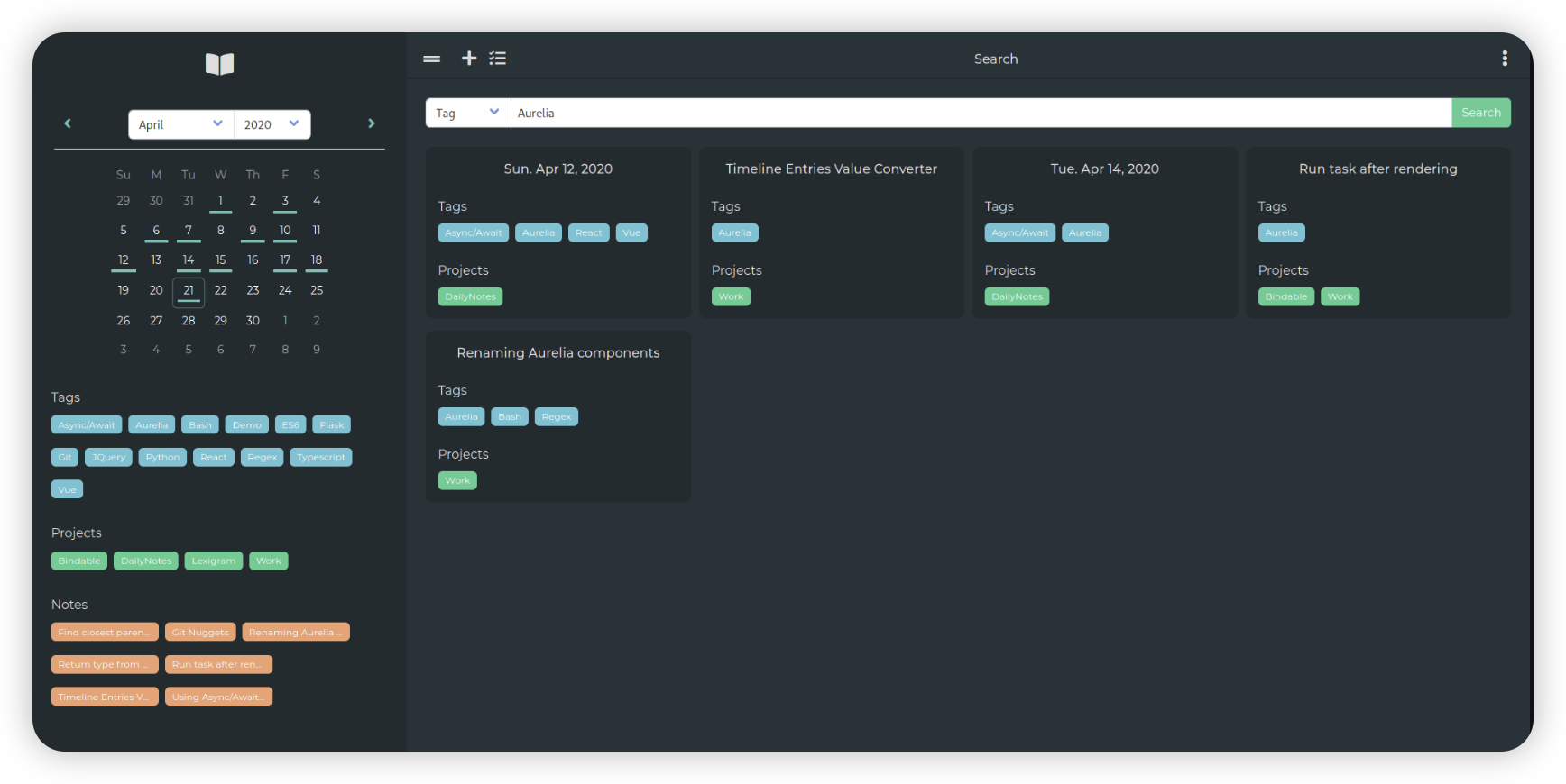 可点击Tag标签、Project工程快速过滤检索,可输入关键词支持全文检索笔记