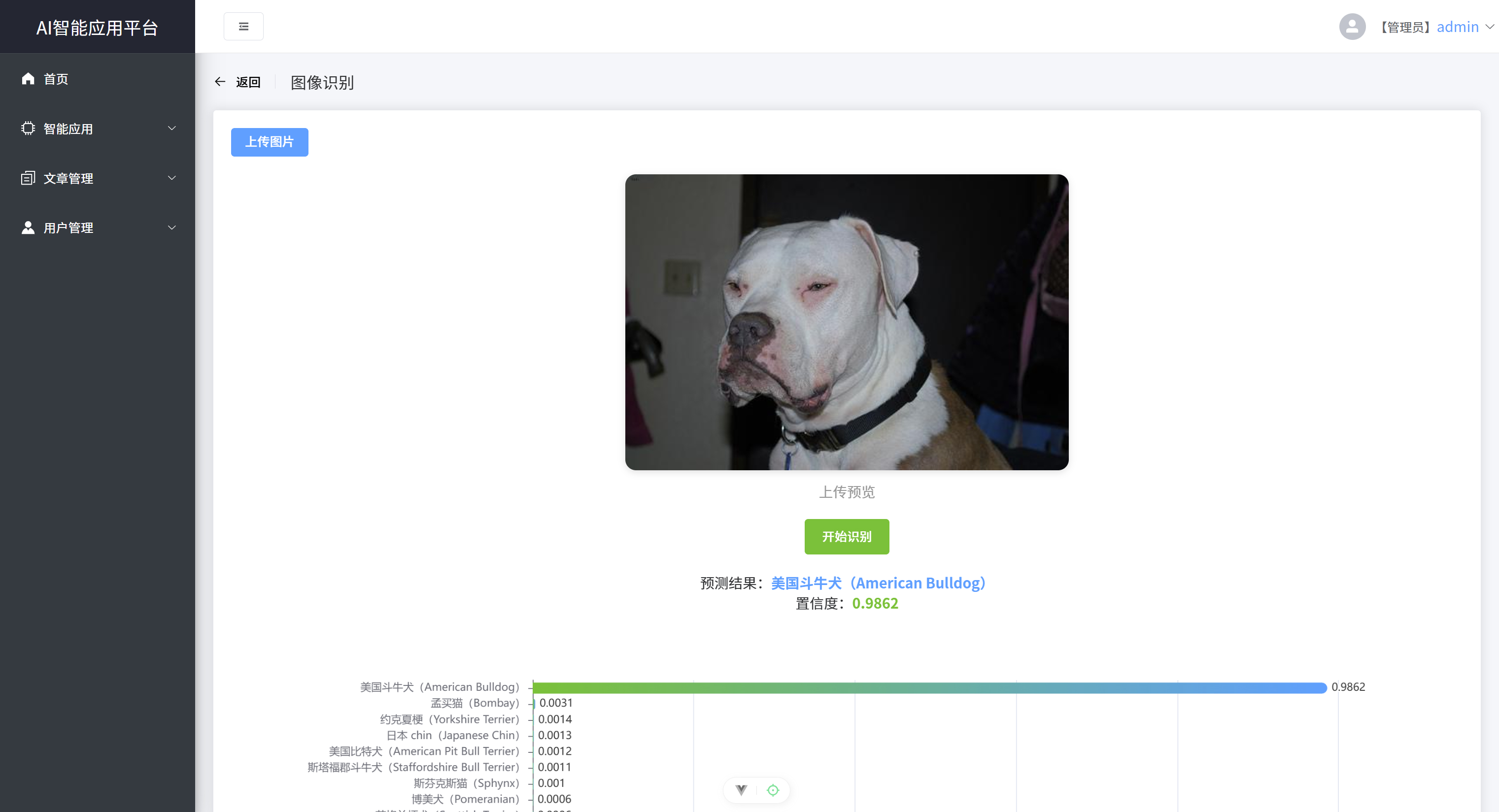 基于此背景,本课题旨在开发一个基于TensorFlow与卷积神经网络(CNN)的智能宠物识别系统。该系统能够对包括阿比西尼亚猫、布偶猫、柴犬、哈士奇等在内的37种常见猫犬品种进行高效识别,并结合Vue3与Django框架构建完整的Web应用平台。系统不仅提供高准确率的图像识别功能,还集成文章管理、数据可视化及智能问答等多种服务,从而为宠物爱好者搭建一个集知识交流与智能识别于一体的实用工具,有效填补了细分领域的技术应用空白。
