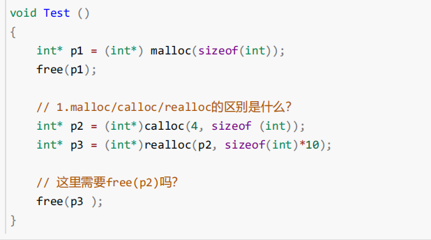 为数组分配内存,并初始化为零 | 内容自动初始化为零 | 2个参数:元素个数 (size_t num) 和每个元素大小 (size_t size) |