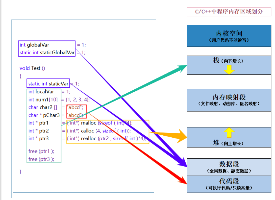 6、**只读数据段:**在代码段和数据段之间,存储字符串常量,虚函数表这些
