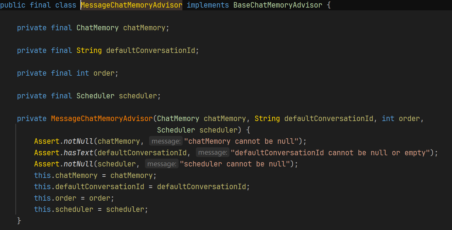 在Advisor中,它们的构造函数大多是私有的,只能通过Builder来创建不同种类的Advisor。图例为ChatMemoryAdvisor