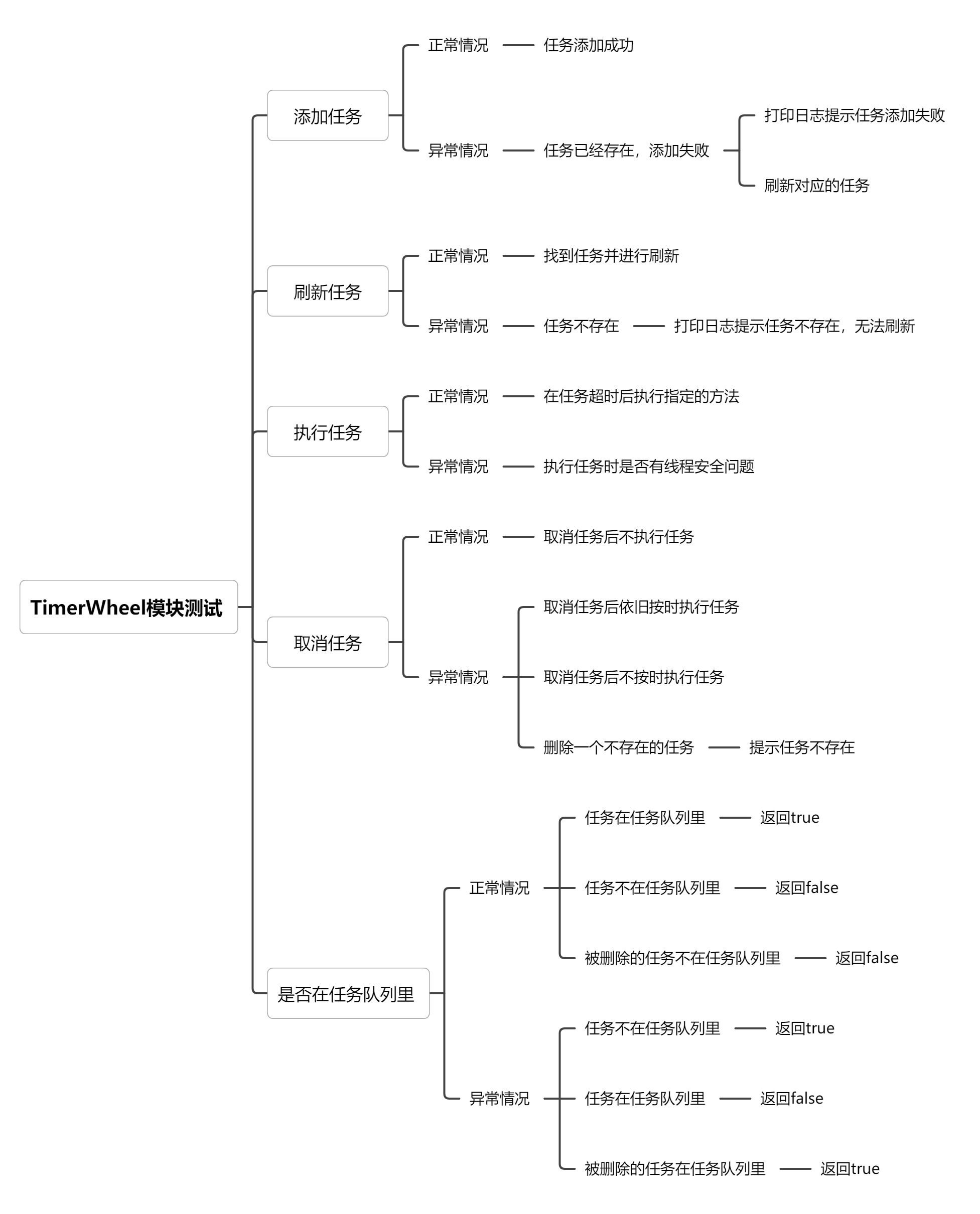 timerwheel模块在项目里主要承担管理超时连接的功能,可以添加销毁连接,刷新连接,添加连接的任务,主要是通过场景法,以下是我设计的测试用例:
