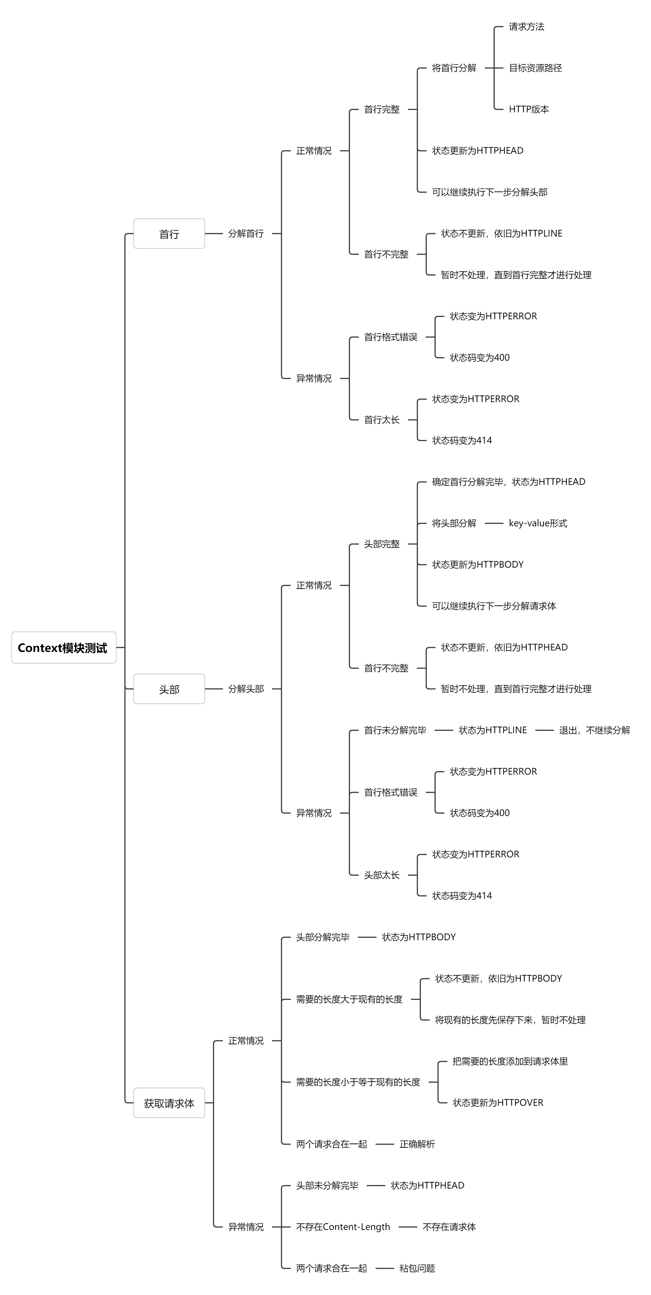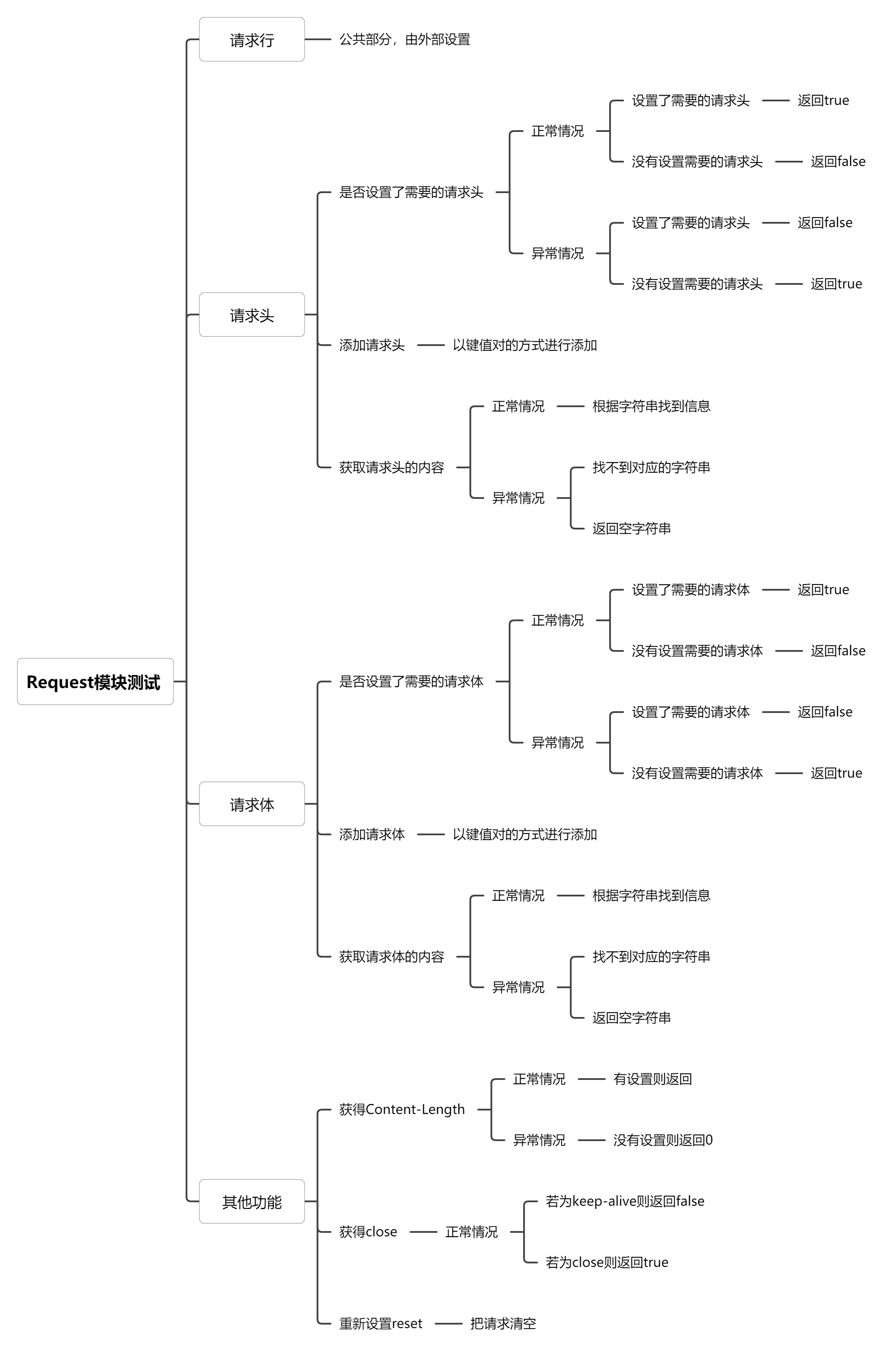 request模块主要是用于解析http请求的,其中包含了请求行,请求头和请求体,分别对这三个部分实现了不同的函数,以下是我设计的测试用例: