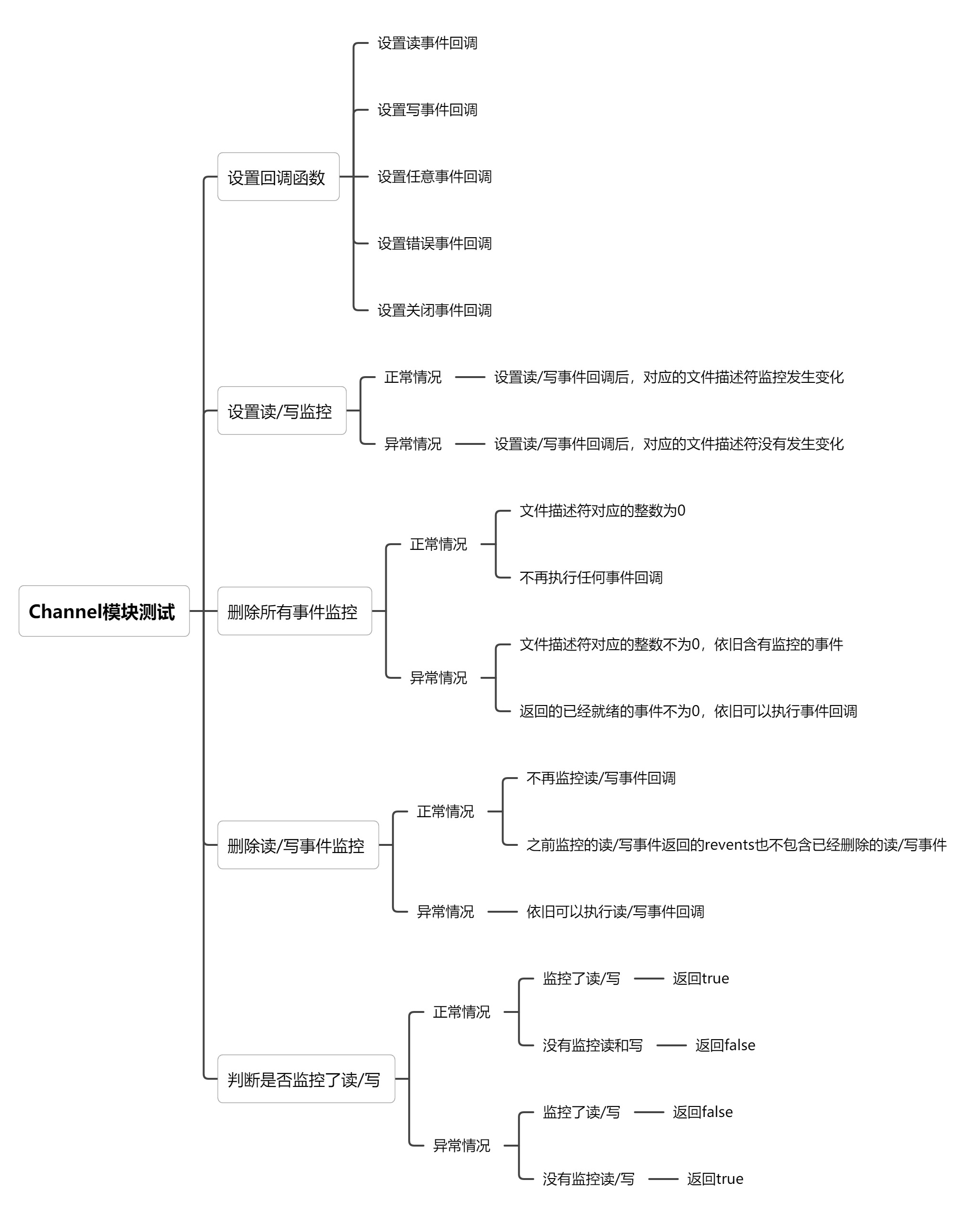 Channel模块用于对一个文件描述符进行事件管理,主要功能有设置读/写事件监控,设置回调函数,判断是否监控了读/写,获得就绪事件,删除所有事件监控,执行回调函数,以下是我设计的测试用例: