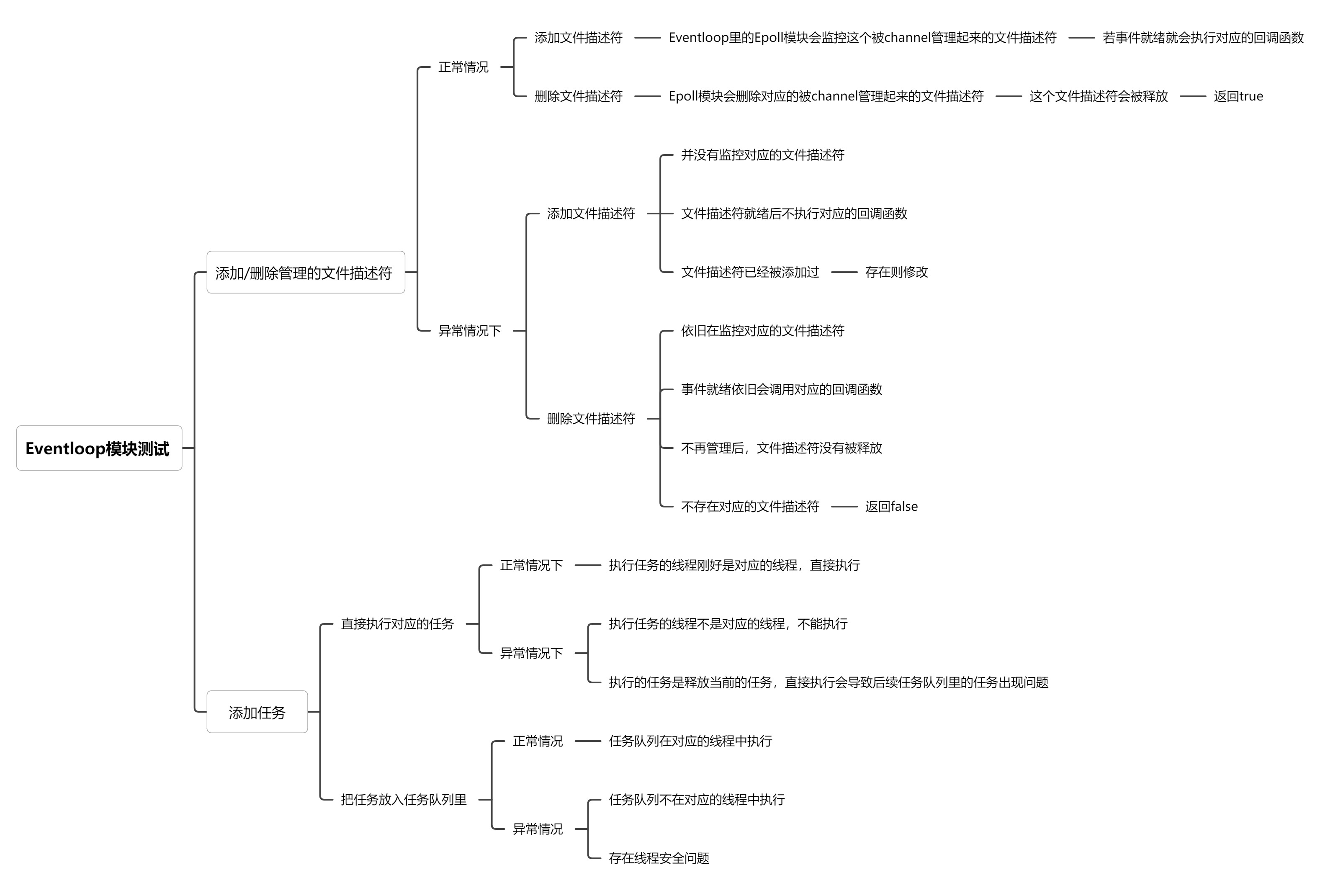 Eventloop模块绑定了一个线程,如果任务都在同一个线程中执行,就可以避免线程安全的问题,临界资源就不必加锁,减少了加锁的消耗,Eventloop集成了Epoll模块,Channel模块和TimerWheel模块,主要功能有添加/删除由channel管理的文件描述符,添加需要执行的任务和执行任务,以下是我设计的测试用例:
