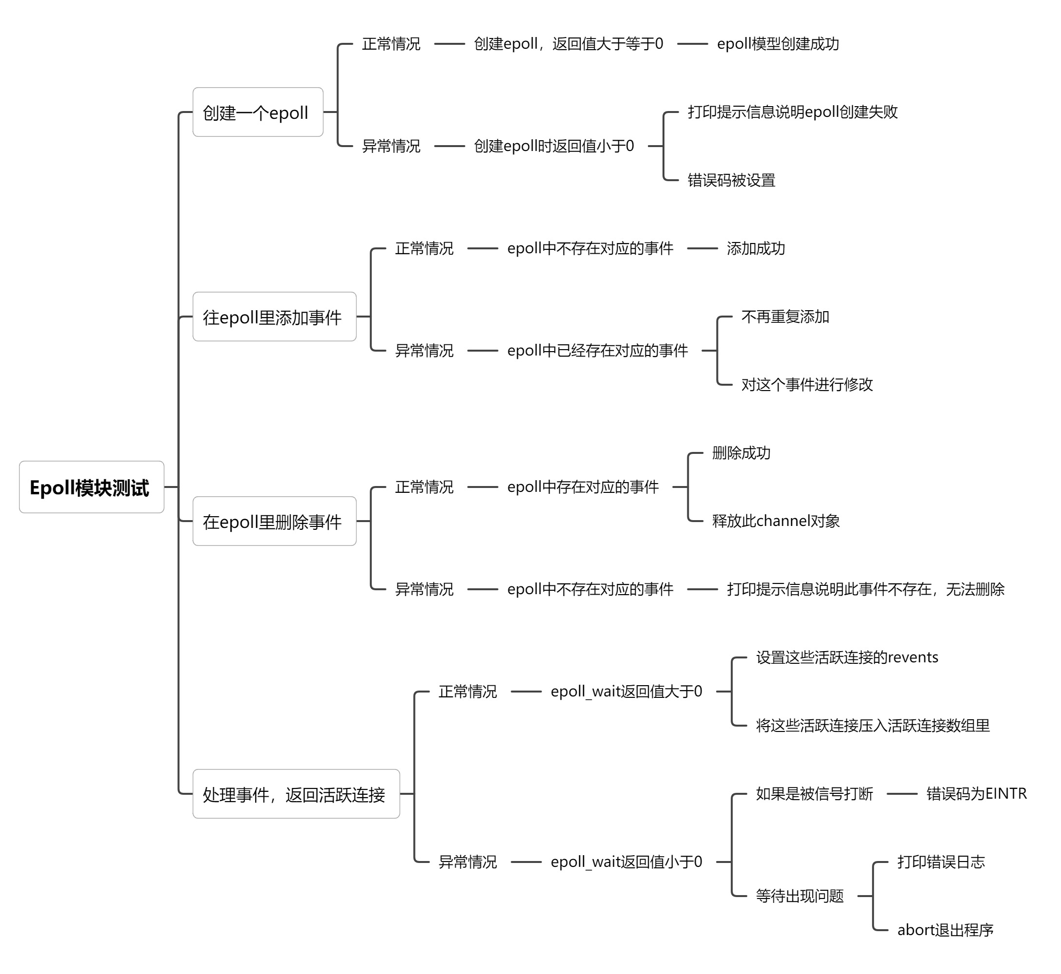 Epoll模块主要是封装了epoll模型的操作,这也是此高并发服务器多路复用技术所在,这个模块主要实现了创建一个epoll文件描述符,往epoll里添加事件,删除事件,处理事件的功能,以下是我设计的测试用例: