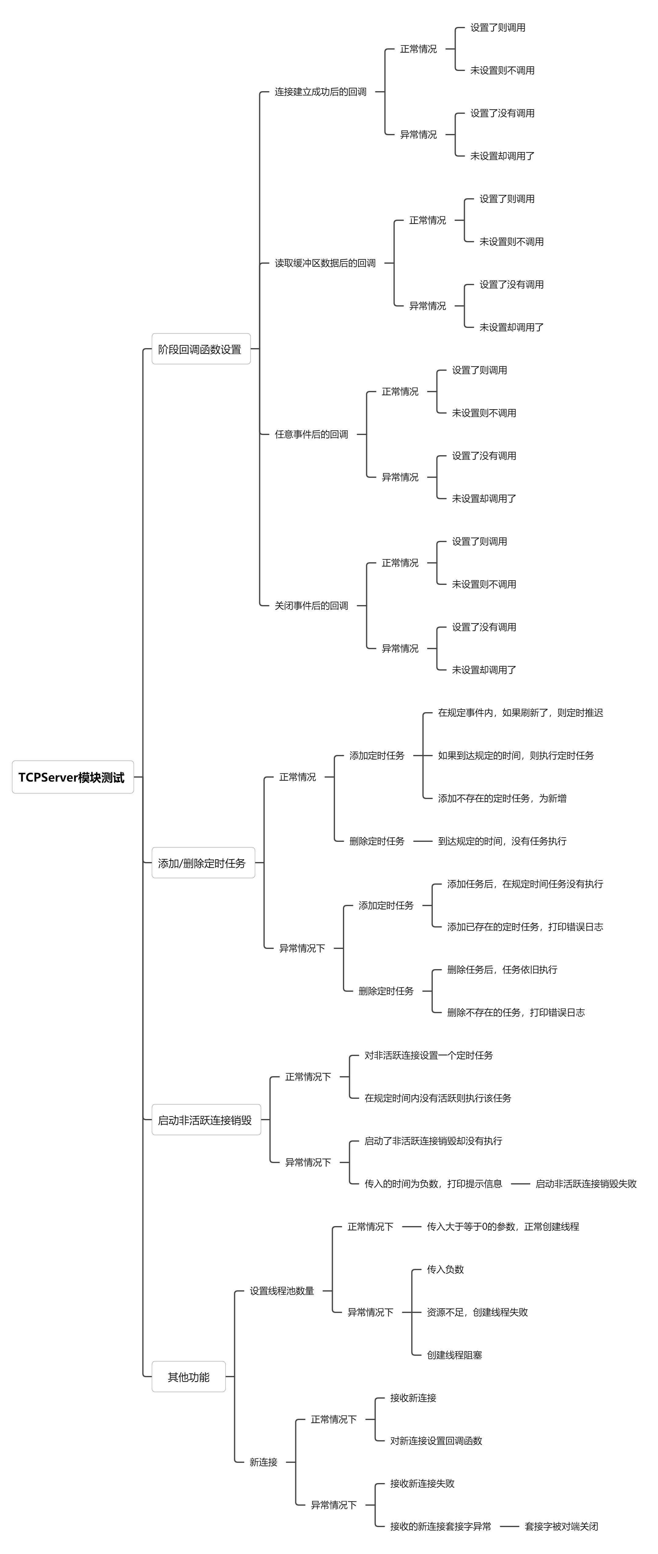 TCPServer是对前面各个模块的集合,其中实现了设置阶段回调函数,添加定时任务,删除定时任务,启动非活跃连接销毁的功能,以下是我设计的测试用例: