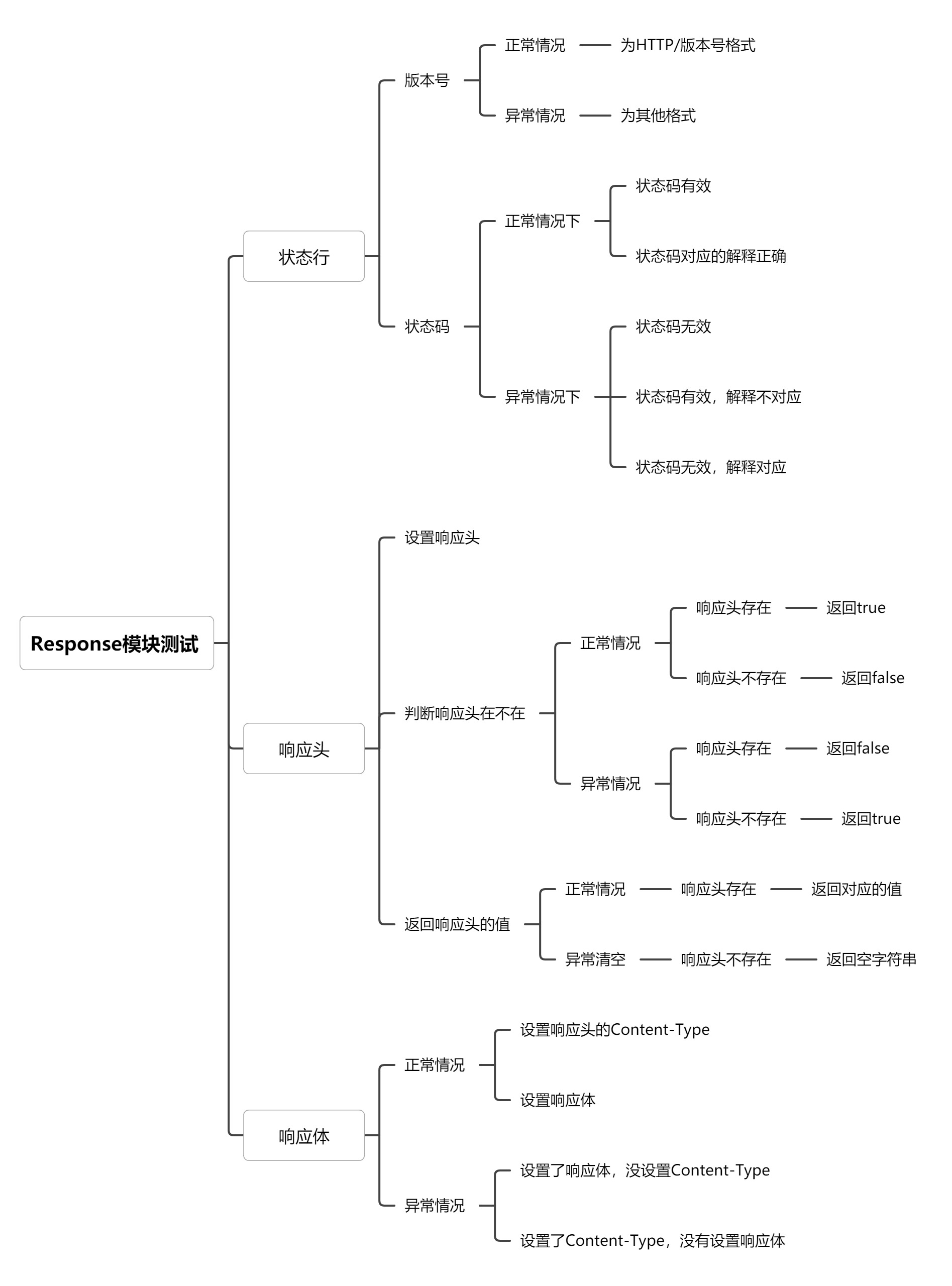 response模块是用来管理http响应报文的,里面严格规定了http响应的格式,包含设置响应头和响应体相关的功能,下面是我设计的测试用例: