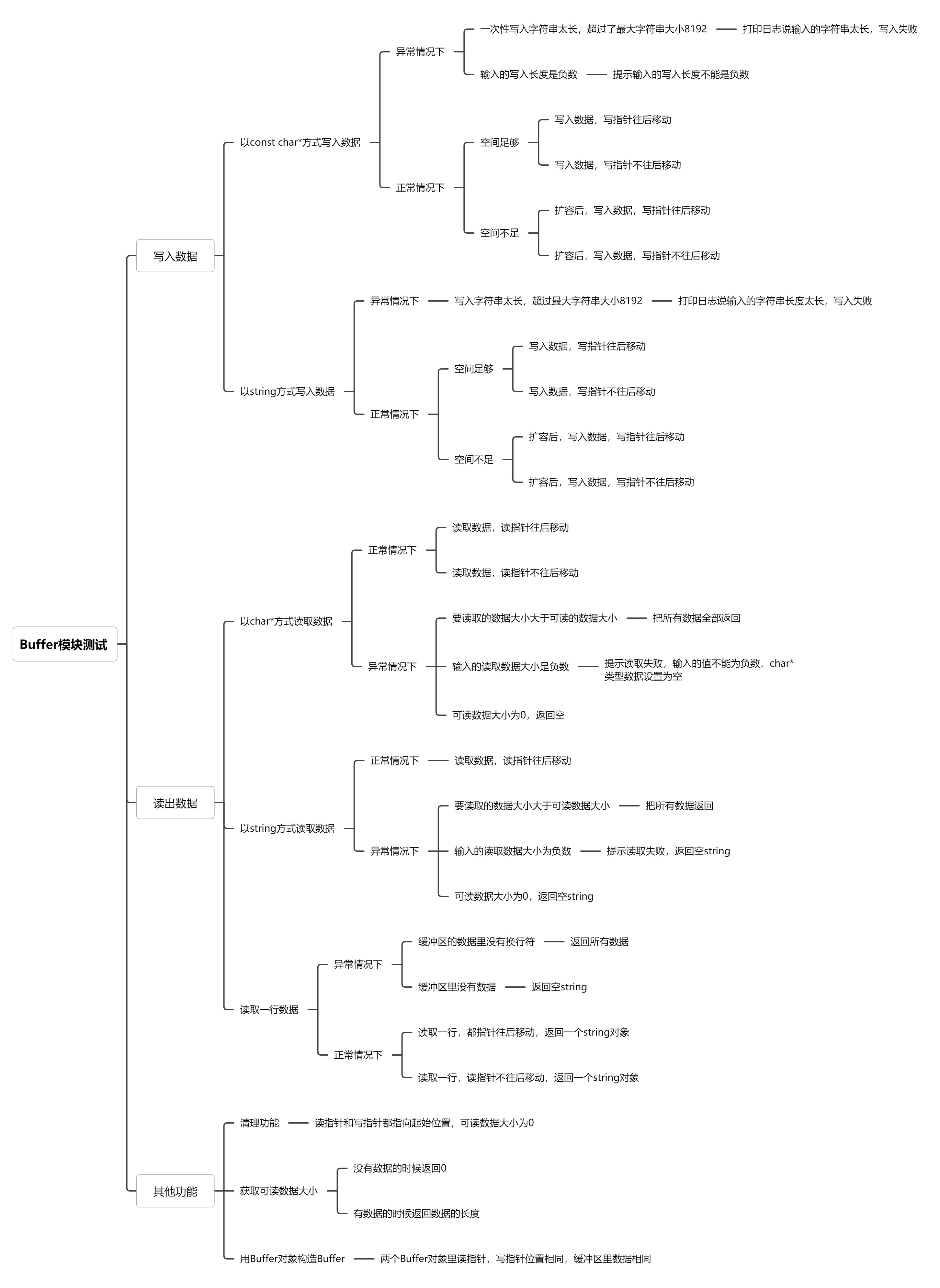Buffer主要的功能是模拟一个缓冲区,可以调用外部的接口对缓冲区进行写入和读出数据的操作,针对这个模块,通过白盒测试,我进行语句覆盖,条件覆盖,组合条件覆盖等方法,设计了如下的单元测试用例: