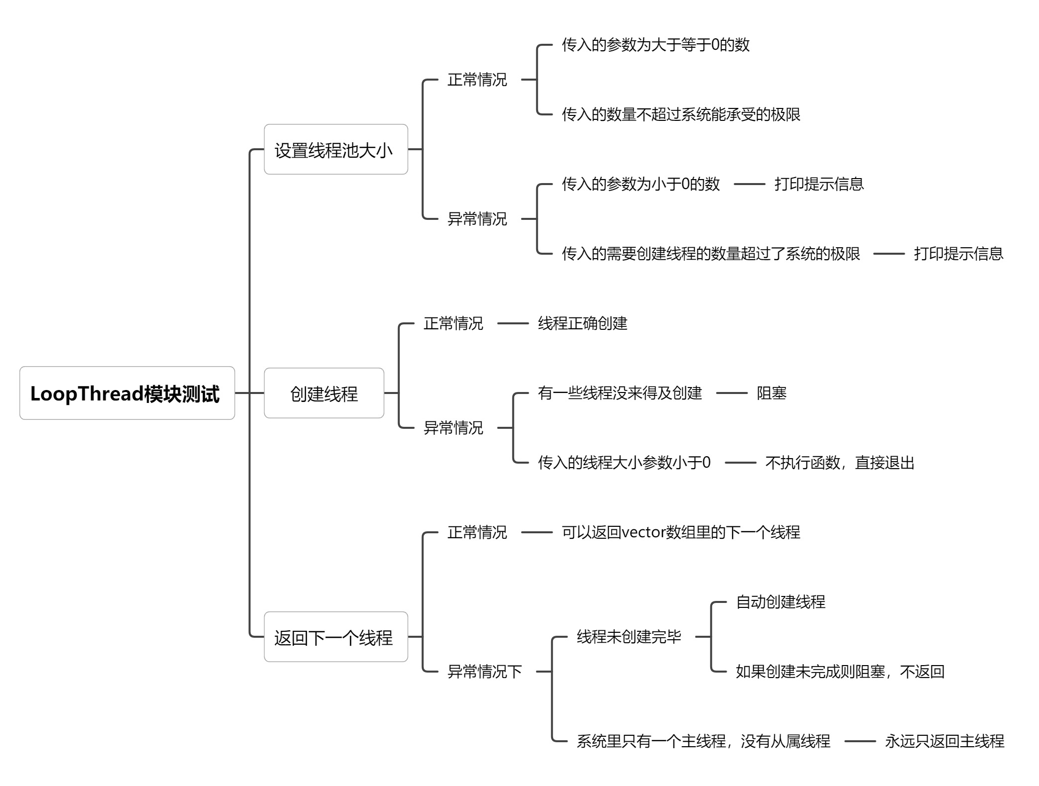 由于Eventloop在创建自身对象的时候对应线程是不确定的,所以需要指定一个对象,在一个明确的线程里创建这个对象,那么这个对象里的所有函数都会在这个线程里执行,LoopThread模块主要实现的功能是封装一个线程,设置线程池大小,创建线程池,返回下一个线程,以下是我设计的测试用例: