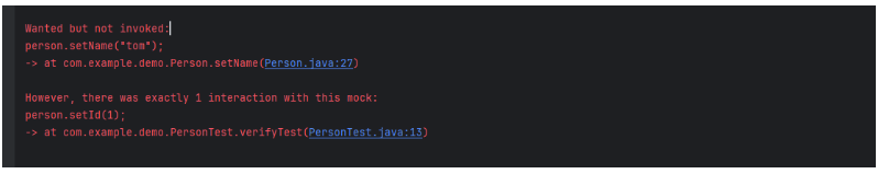 错误信息显示你期望person.setName("tom")被调用,但实际只有person.setId(1)被调用了。