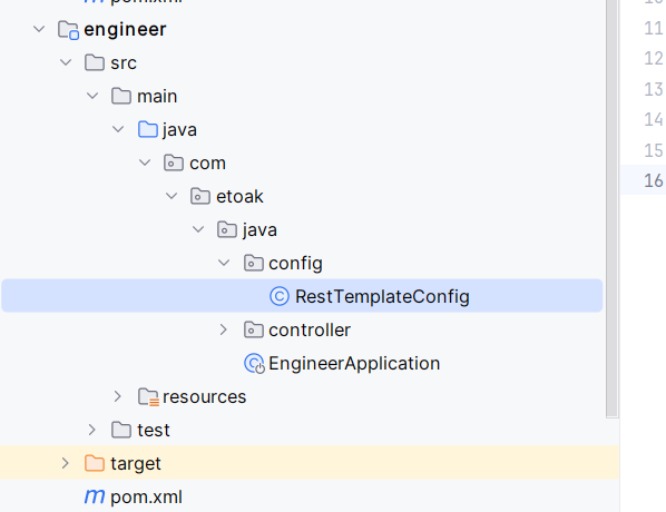 (1)在Engineer模块添加RestTemplate配置类,在com.etoak.java包下创建config包,并在config包下新建RestTemplateConfig类,代码如下: