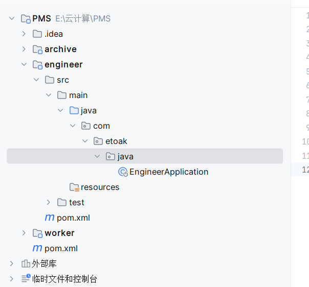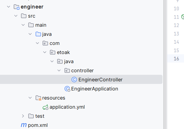 在engineer/src/main/java/com/etoak/java目录下,新建EngineerApplication类,并修改代码如下。