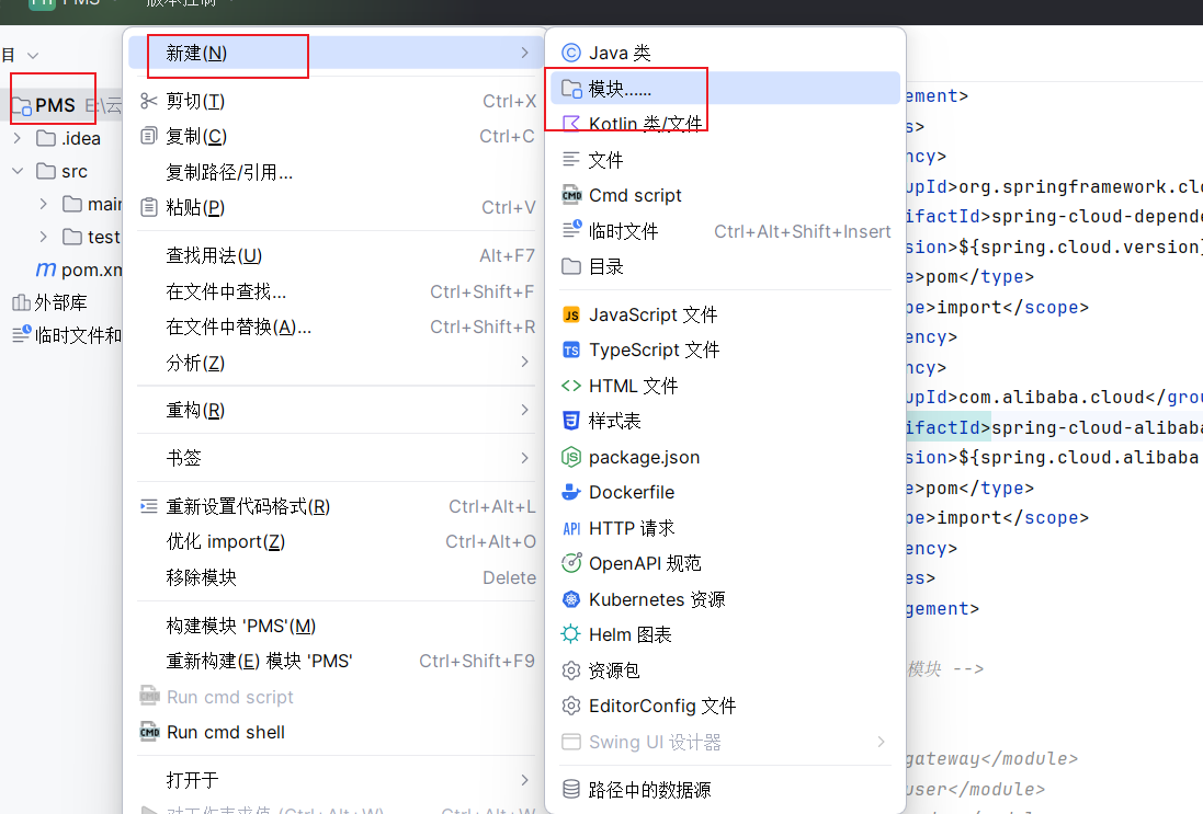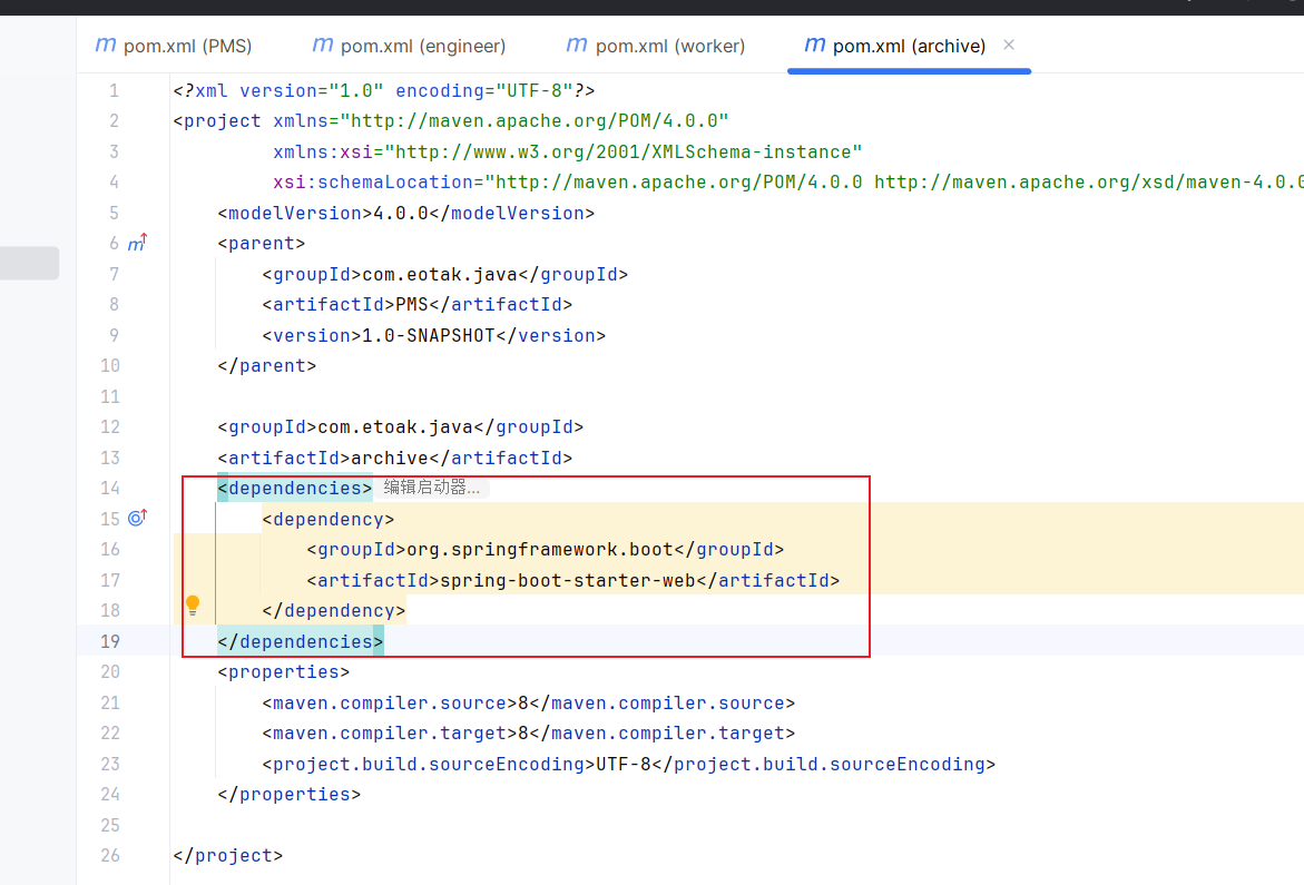 (1)PMS作为父工程,修改PMS项目下的pom.xml,添加Maven依赖,如下代码所示。