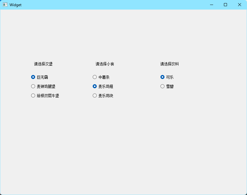 | QRadioButton | 多选一场景(性别、支付方式) | 自动排他(同一组仅一个选中);支持默认选中 | 圆形单选框 + 文本 | toggled(bool) |