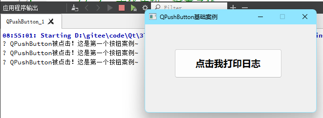 启动程序后,界面上会出现一个带有加粗字体的按钮,点击按钮后,Qt Creator 的 "应用程序输出" 面板会打印出调试信息。