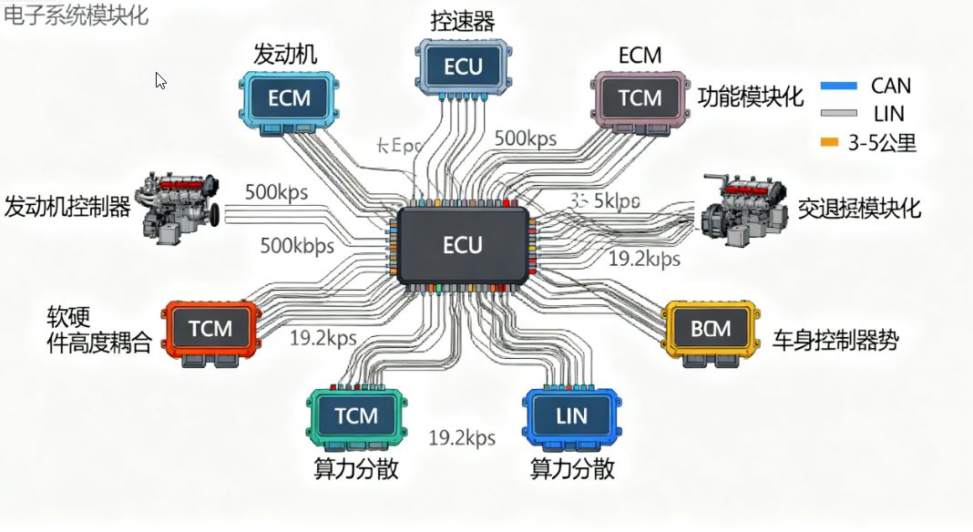 模块化架构是EEA的初始阶段,主要应用于2010年之前的传统燃油车。在这一阶段,汽车电子系统以"功能模块化"为设计理念,每个功能对应一个独立的ECU,如发动机控制器(ECM)、变速箱控制器(TCM)、车身控制器(BCM)等。ECU之间通过CAN总线(传输速率通常为500kbps)或LIN总线(传输速率通常为19.2kbps)进行通信,总线网络呈分散式布局。