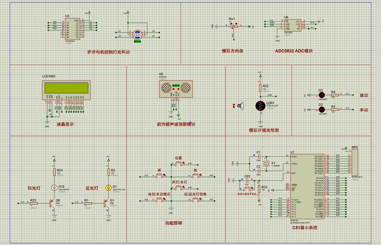 基于51单片机的汽车近光远光灯模拟仿真,可通过超声波测距模块进行距离检测,模拟环境光进行远近光灯切换,模拟方向盘转动进行随动大灯转向功能