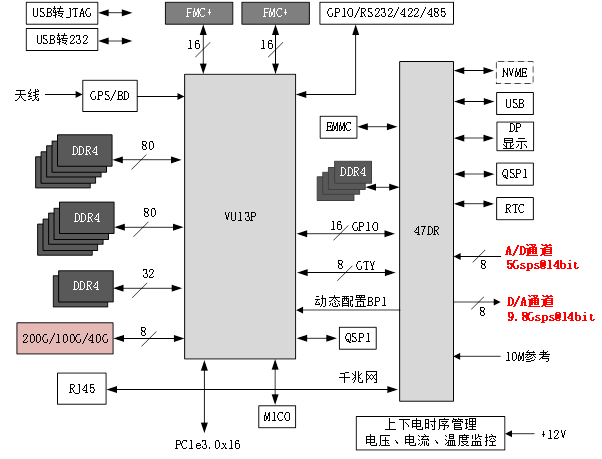 - 支持8收(5Gsps@14bit)8发(9.8Gsps@14bit)的宽带AD/DA