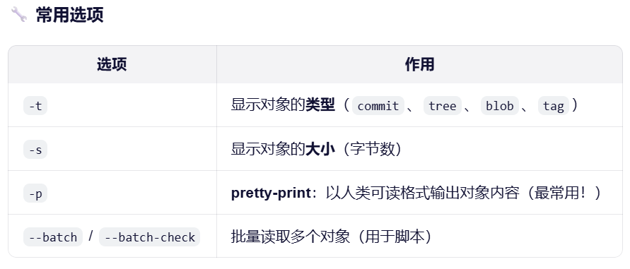 [6.git cat-file : 是 Git 中一个底层(plumbing)命令,用于查看 Git 对象的内容或信息。它主要用于调试、检查仓库内部结构,或理解 Git 如何存储数据。](#6.git cat-file : 是 Git 中一个底层(plumbing)命令,用于查看 Git 对象的内容或信息。它主要用于调试、检查仓库内部结构,或理解 Git 如何存储数据。)