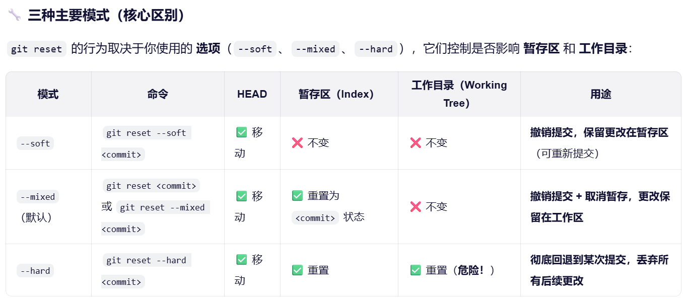 [9.git reset : 是 Git 中一个强大但需谨慎使用的命令,主要用于移动 HEAD 指针、重置暂存区(index)和/或工作目录到某个指定状态。它常用于撤销提交、取消暂存文件或丢弃更改。](#9.git reset : 是 Git 中一个强大但需谨慎使用的命令,主要用于移动 HEAD 指针、重置暂存区(index)和/或工作目录到某个指定状态。它常用于撤销提交、取消暂存文件或丢弃更改。)