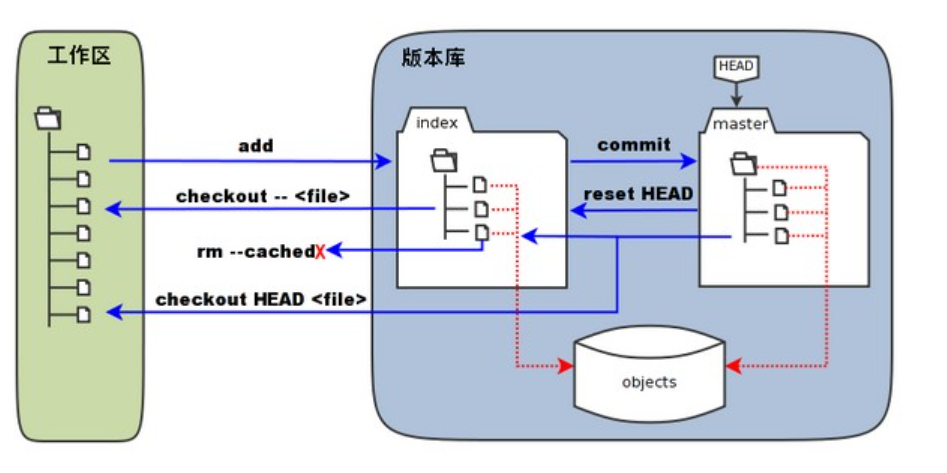 - **暂存区:**英文叫 stage 或 index。一般存放在 .git 目录下的 index 文件(.git/index)中,所以我们把暂存区有时也叫作索引(index)。