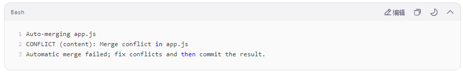 当你执行 git merge 或 git pull 后,如果出现冲突,Git 会提示: