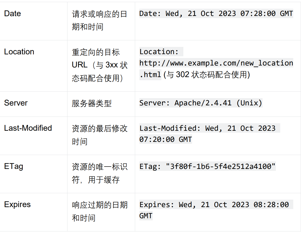 - 例如,在 HTTP 响应中,可能会看到类似于以下的头部信息:
