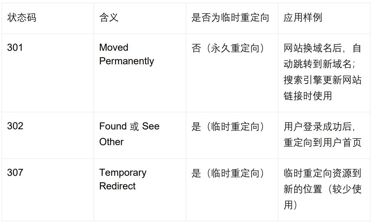 - 同样地,服务器也会在响应中添加一个 Location 头部来指定资源的新位置。浏览器会暂时使用新的 URL 进行后续的请求,但不会缓存这个重定向。