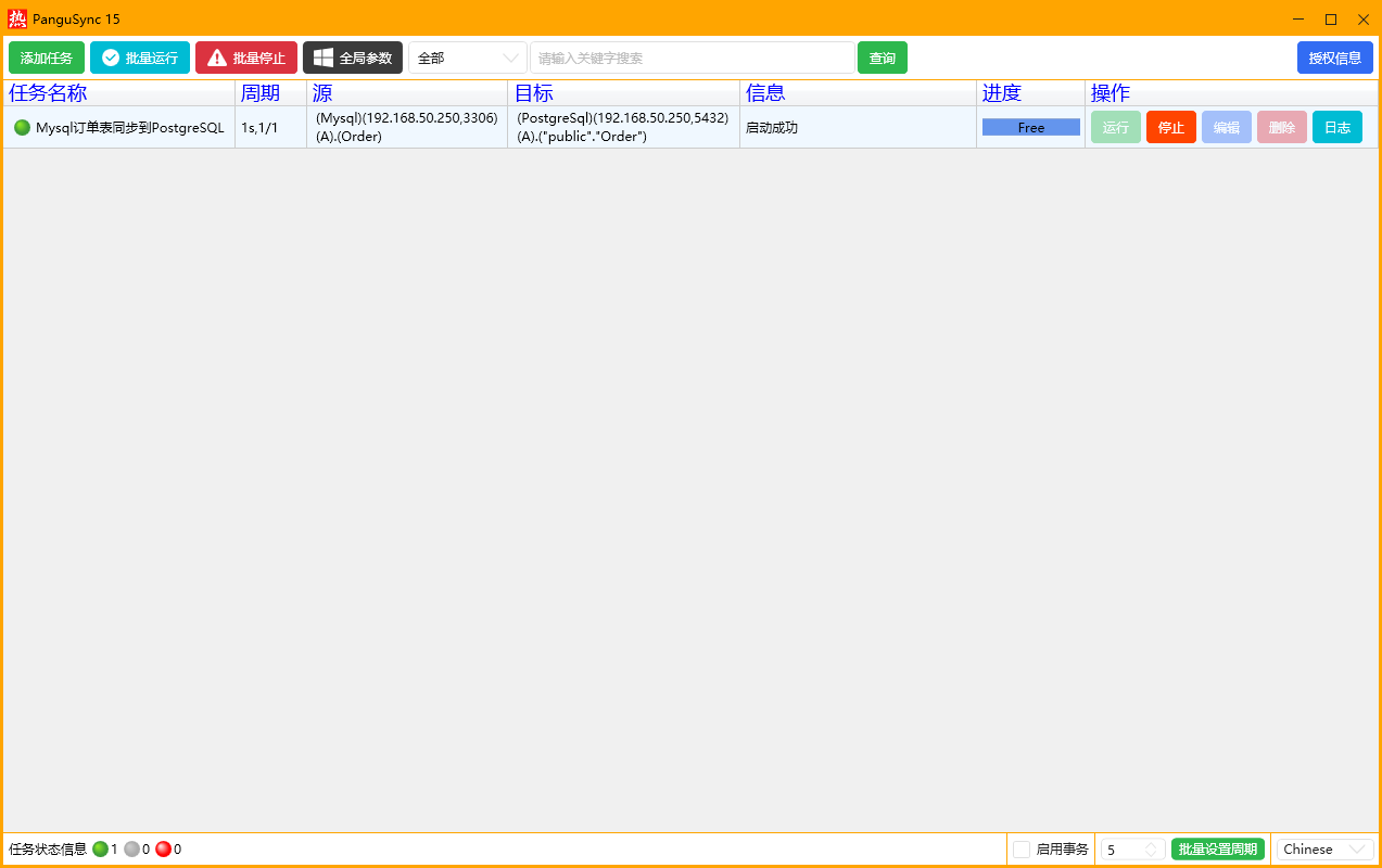 点击保存后,会在主界面显示一个任务,将Mysql的订单表准实时同步到Postgresql,如下图所示,点击运行就是可以开始了,右下角启用事务后,同步时会一批一批地提交。