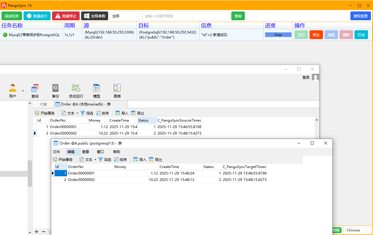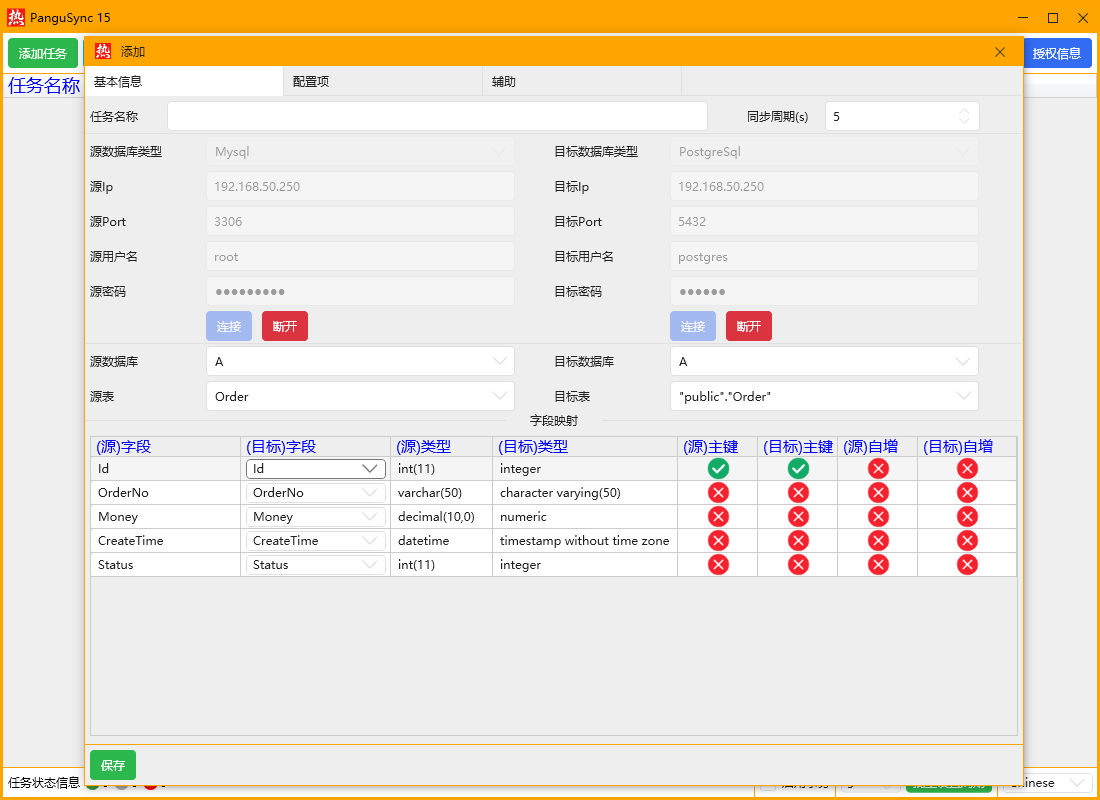 Mysql增量同步到PostgreSQL方法有很多,我今天是用了一款数据库增量同步软件来实现,非常方便,这款本身支持三种数据库的增量同步,Mysql、Sqlserver、PostgreSQL可以随意组合,配合GUI工具,鼠标点点点就可以实现一个表的增量同步,下面就简单举个例子,比如我Mysql有A库有一张订单表Order,然后PostgreSQL的A库也有一张订单表,我要实现Mysql的订单数据准实时同步到PostgreSQL,