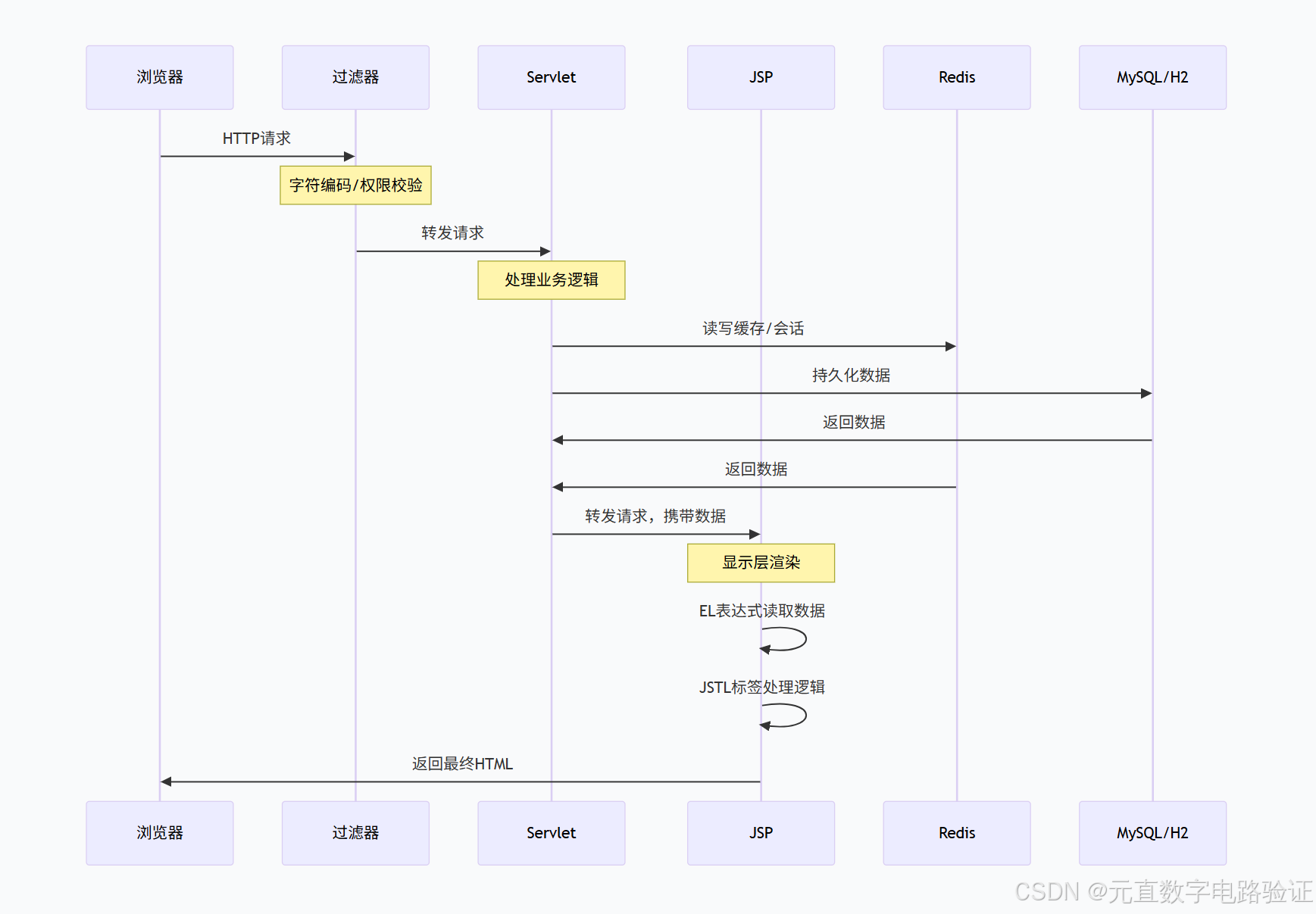 过滤器 :在请求到达Servlet之前 或响应发回浏览器之前 进行预处理或后处理,常用于编码转换、权限校验-3。