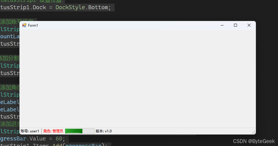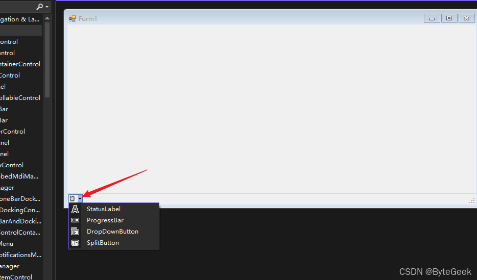 从Visual Studio工具箱中拖拽StatusStrip控件到窗体上,默认会停靠在窗体底部(Dock = Bottom),然后通过右侧下拉箭头添加各种子控件。