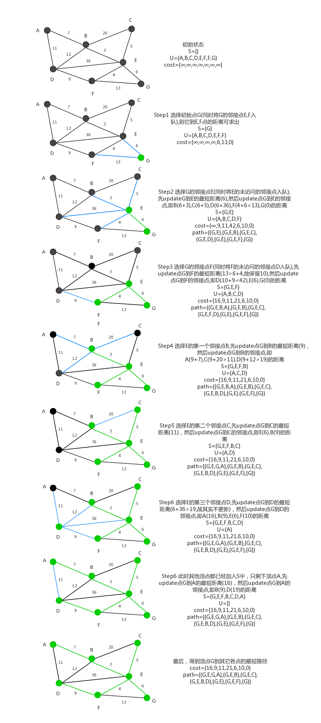 dist[v] = min(dist[v], dist[u]+w)); - 重复直到所有节点处理完毕。