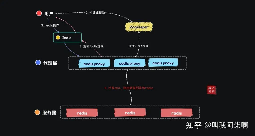 在codis的架构中,分为codis proxy代理层 和server服务层。 codis proyx让整个codis看起来就像一个"大的单点redis",同时proxy实现了redis协议,所以用户可以使用Jedis连接codis(大的单点redis)。