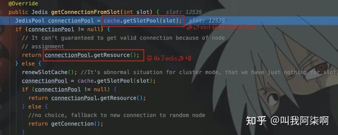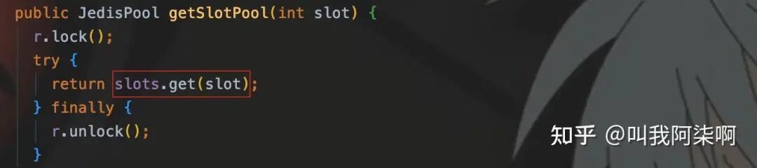 再调用getConnectionFromSlot() ,利用计算出来的slot,从cache中获取这个slot对应的JedisPool。