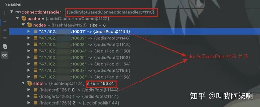 在初始化JedisCluster时,其connectionHandler 属性的cache 属性,会自动为所有的redis节点创建一个JedisPool,存放在nodes 中,并且在slots属性中,将16384个slot与所在redis的JedisPool形成映射关系。如下图所示:
