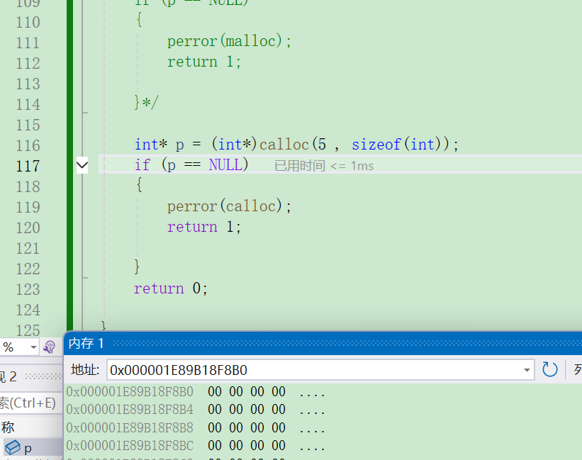 cpp#include<stdlib.h> int main() { int* p = (int*)malloc(20); if (p == NULL) { perror("malloc"); return 1; } int i = 0; for (i = 0; i < 5; i++) { *(p + i) = i + 1; } return 0; }