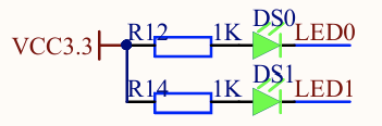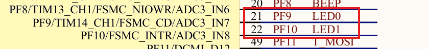 从原理图中可以看出,控制引脚 PF9,PF10为GPIO输出引脚,且输出低电平可以点亮 LED 灯。