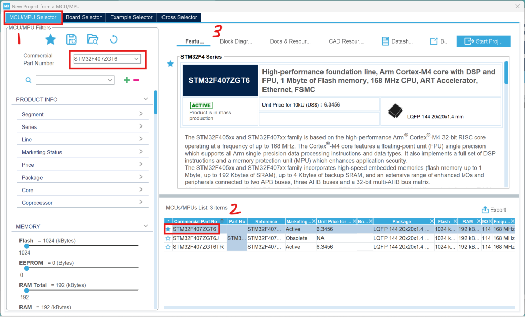 - 通过筛选或搜索的 MCU 列表,会显示出具体型号,封装,Flash,RAM 等参数,单击星号收藏,双击MCU型号进入项目管理视图。