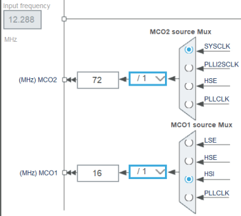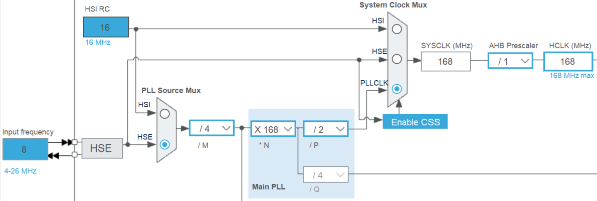 - 系统时钟选择器:系统时钟 SYSCLK 是为 MCU 大部分组件提供时钟信号的时钟源,输入时钟有 HSE,HSI,PLLCLK。Enable CSS 按钮可以启用时钟安全系统,使用 HSE 时该按钮才有效,当 HSE 发生故障,会发出一个 CSSI 的中断信号,自动切换到 HSI 作为时钟源。