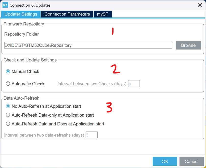 - MCU 固件包和扩展包安装路径,建议设置后就不再更改,我设置的路径:D:\IDE\ST\STM32Cube\Repository