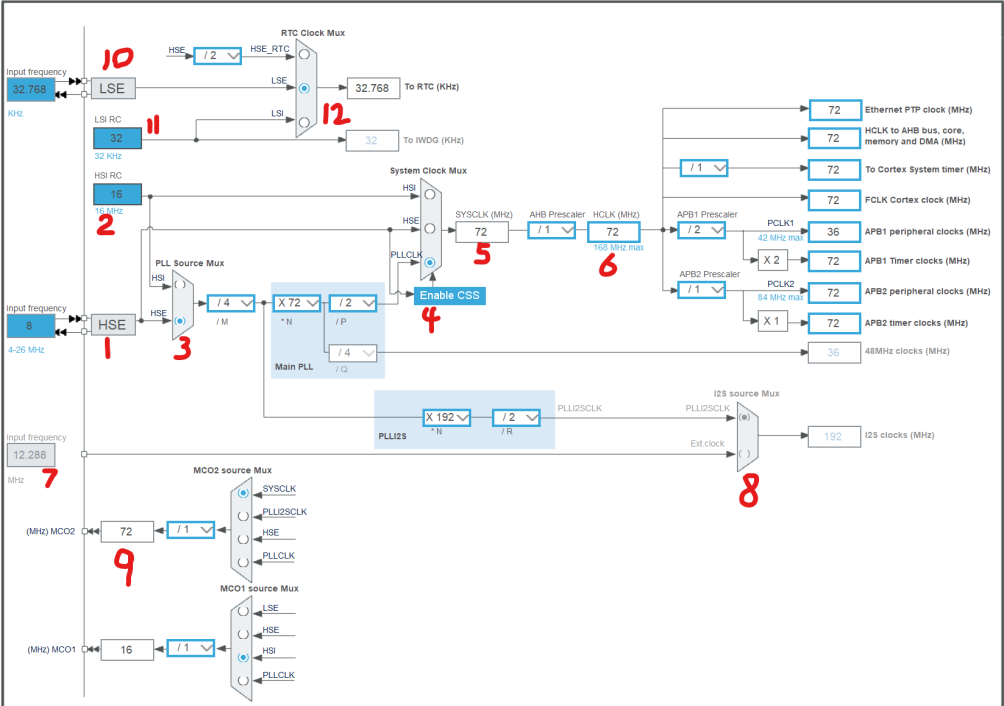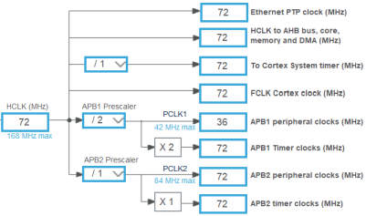 - HCLK 时钟:CPU 的时钟信号,为 AHB 总线,内核,APB1 总线和 APB2 总线提供时钟,HCLK 最高频率 168MHz,可以在文本框修改,例如输入 72 后,软件会自动进行修改。